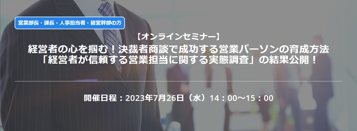 【オンラインセミナー】経営者の心を掴む!決裁者商談で成功する営業パーソンの育成方法:https://sb-service.co.jp/seminer-tokyo-230726online/