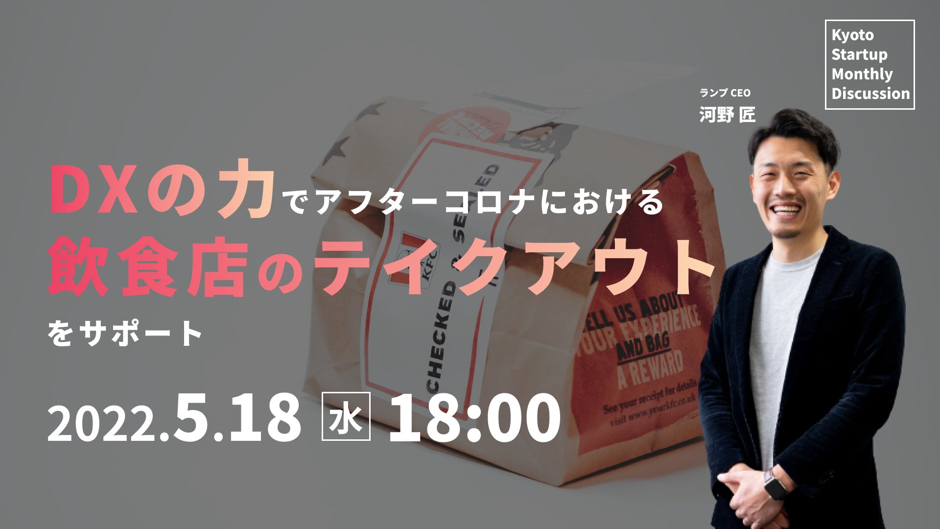 コロナにより非常に厳しい状況にある飲食店を救うべく、テイクアウト営業のデジタル化で、モバイルオーダーのプラットフォームの開発を進めてこられました。今回「DXの力でアフターコロナにおける飲食店のテイクアウトをサポート」をテーマに、起業された経緯、提供されるサービスに辿りついた背景と今後の展開、京都を拠点にスタートアップをする理由などをお伺いし、最後にこれから起業を目指す方へのメッセージをいただきます。