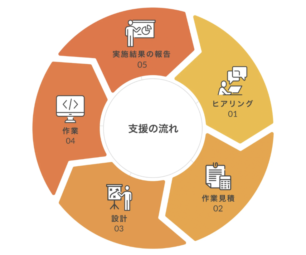 まずお客様の要望や問題点をしっかりと理解するためのヒアリングを行い、ヒアリングの内容をもとに作業の見積もりを作成いたします。その後、詳細な設計フェーズに移行し、設計に基づいて実際の作業を進めていく流れです。作業完了後も、次のステップや改善点についてのヒアリングを再度行うことで、常に質の高いサポートを提供することを目指しています。