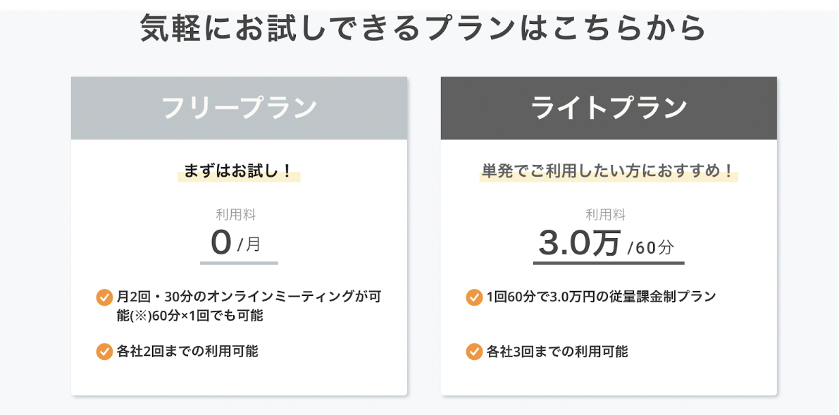 サポートの内容 | 月2回(30分)のオンラインミーティングが可能 | 1回60分の従量課金性プラン |