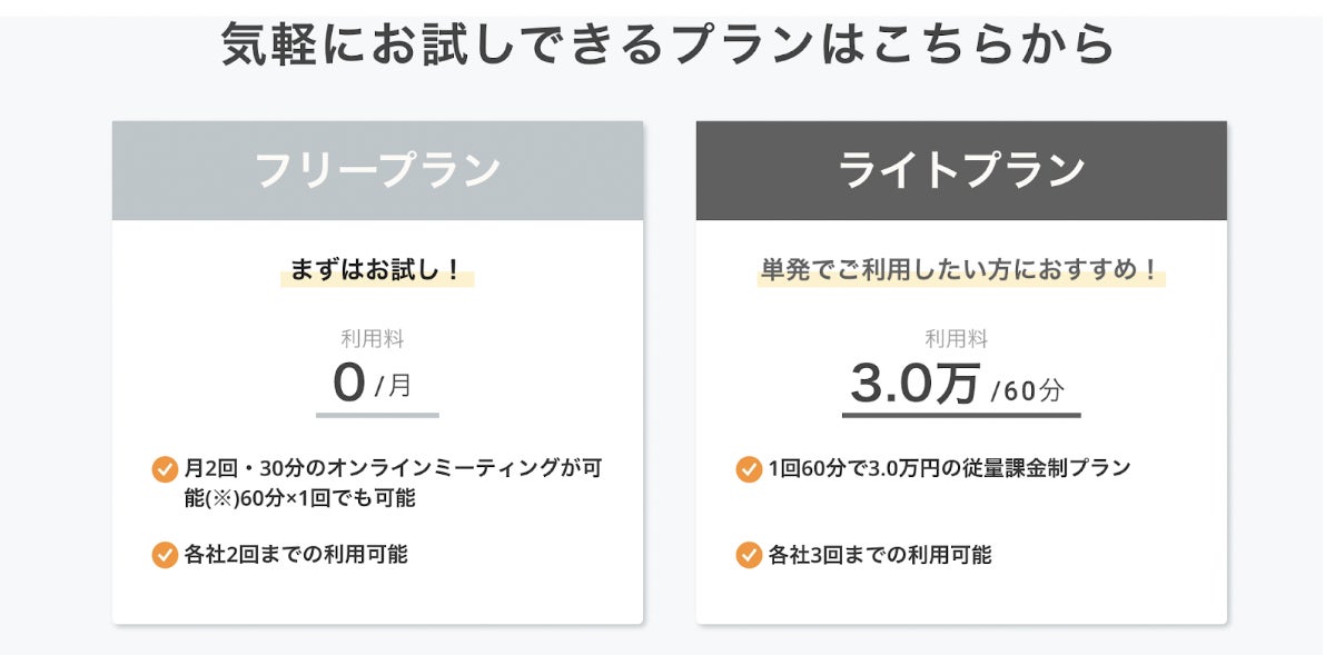気軽にお試しできる“フリープラン”と、単発でのご利用も可能な“ライトプラン”の2つのプランをご用意。