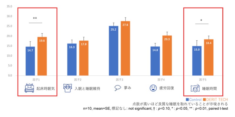そこで、皮膚の感覚受容器を介して、筋活動を賦活化させ良好な身体効果を与えるボクサーパンツ「デリットテック」は、睡眠時に着用することで寝姿勢に影響を与え、睡眠の質やそれによる疲労回復効果にも機能を果たすのではないかと考えました。調査の結果、特に中途覚醒時間・回数において改善がみられたことから、「デリットテック」の着用が、筋活動を賦活化させ、インナーの筋肉に力を入れやすくする効果をもたらすことで、寝返りといった体位変換に効果的な影響を与える可能性が示唆されました。