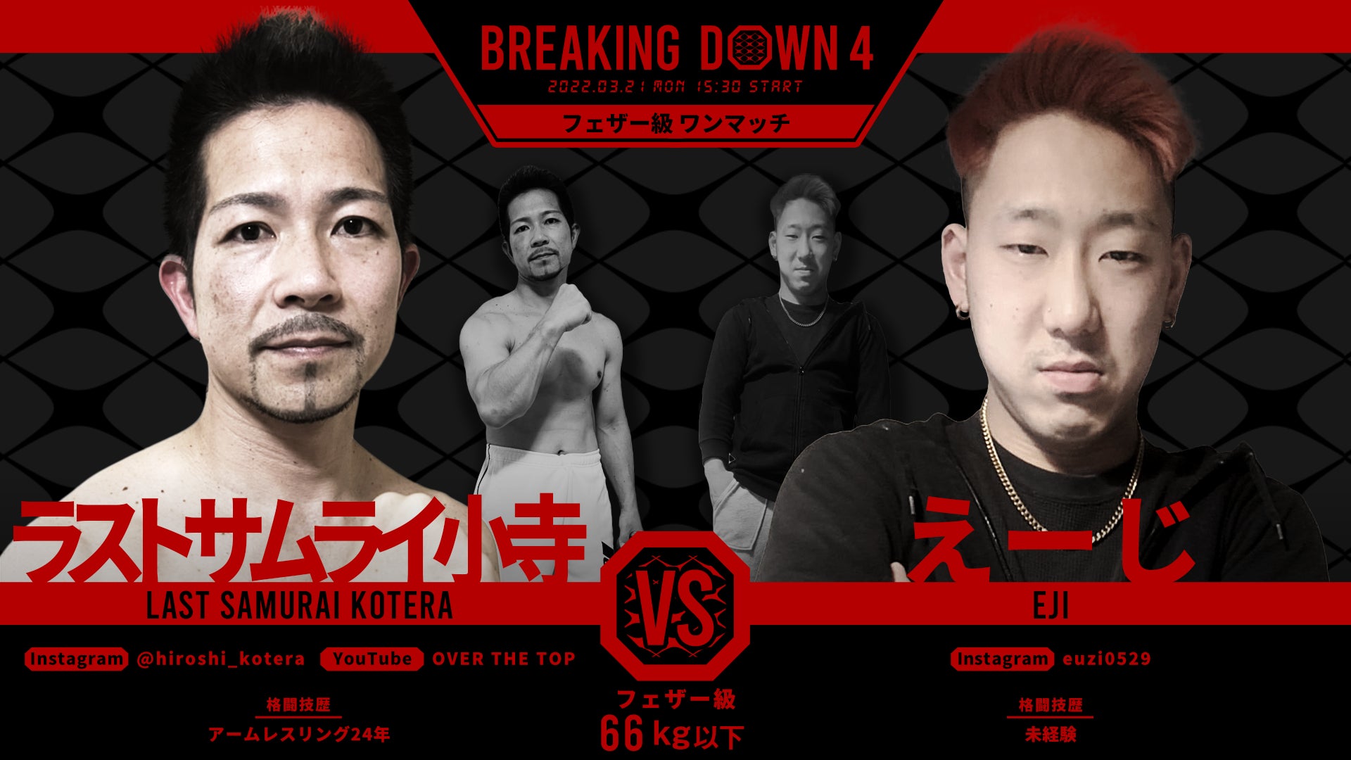 - 第 2 試合:フェザー級ワンマッチ 66kg 以下 ラストサムライ小寺 vs. えーじ