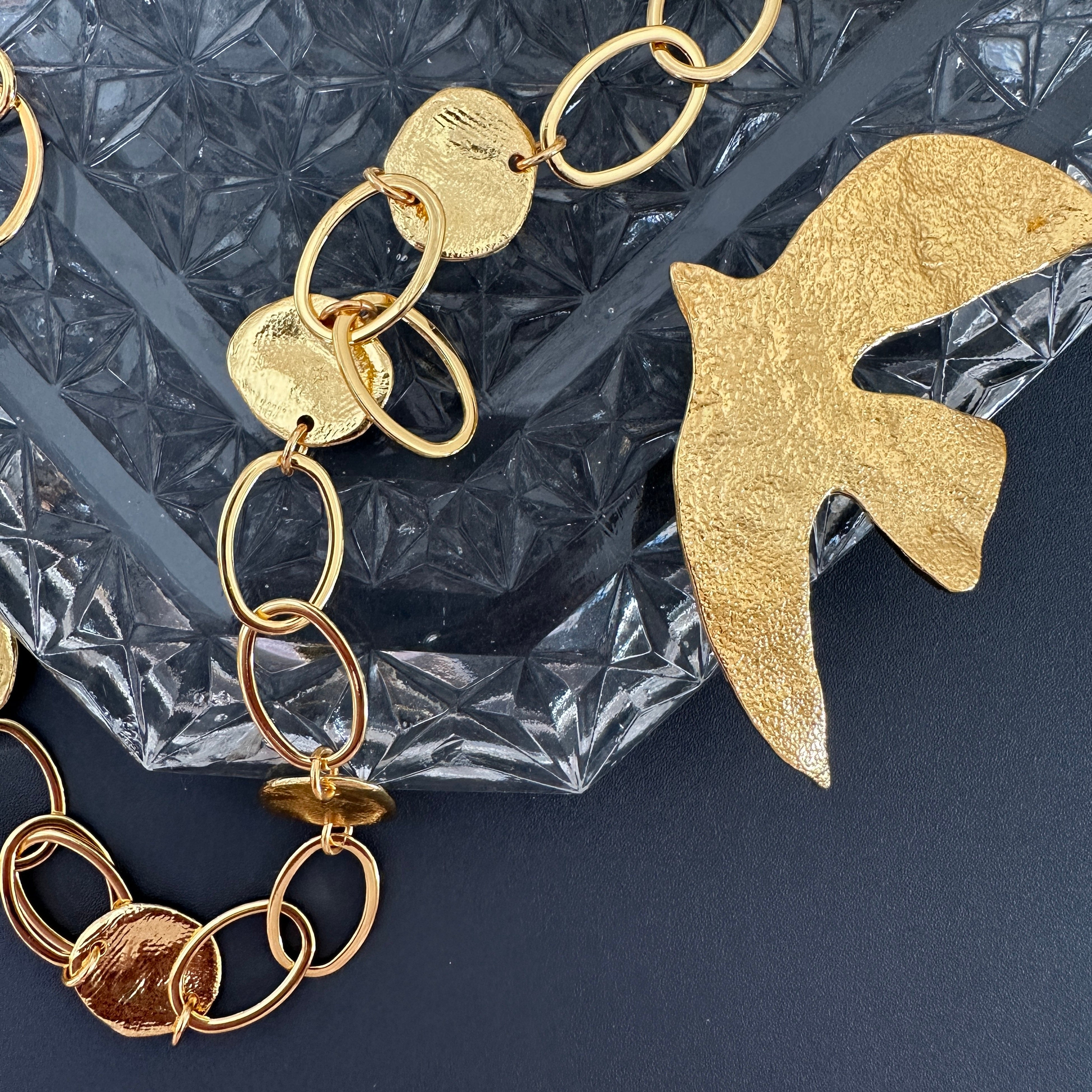 ブランドのマークにもなっている愛と平和の象徴:鳩のモチーフ「ラ・コロンブ」が、様々なアイテムに大胆に、または密やかに落とし込まれています。ネックレスやイヤリング、ブローチのほか、天然石を樹脂で固めたニュアンスのある輝きの「アミュレット」でも、ターコイズや白など爽やかな色の「ラ・コロンブ」をお楽しみいただけます。不安定な時代だからこそ平和を象徴するモチーフを身につけてみては?