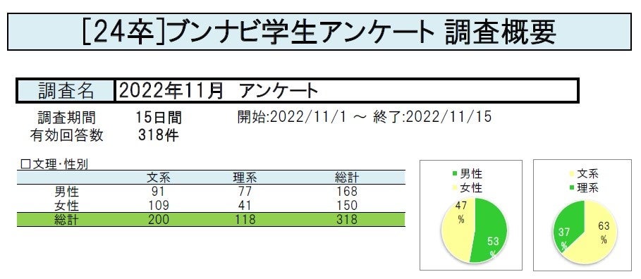 株式会社文化放送キャリアパートナーズ(本社:東京都港区、社長:平田眞人)は、2024年卒業予定の学生を対象とした「2024年卒ブンナビ学生調査(2022年11月実施)」の調査結果を発表しました。11/1-11/15で、318件の回答を得ました。概要は以下の通りです。