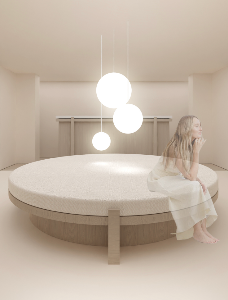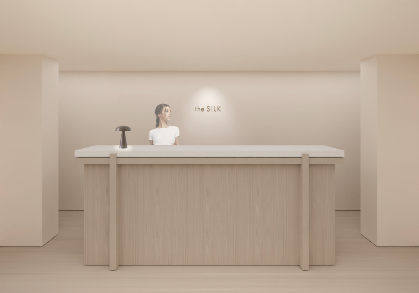 店内は、the SILKのブランドカラーをベースに木目をデザインに織り込んだ、優しく包まれるような空間。