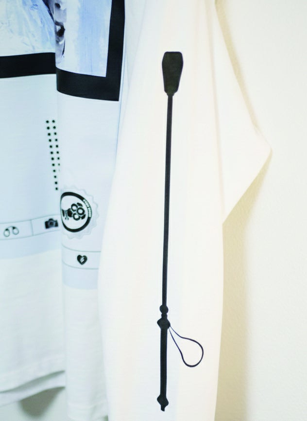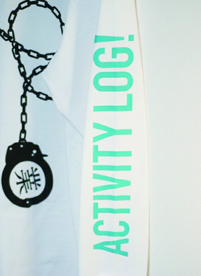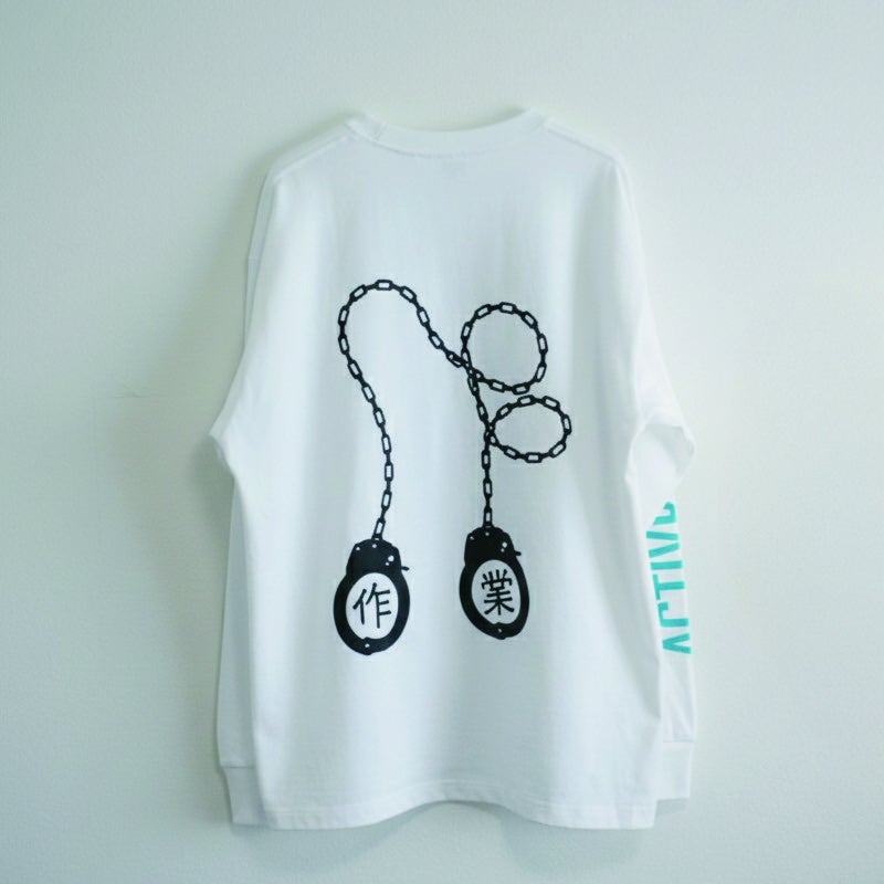 2004年から3年半にわたり中原が書き続けた日記を書籍にまとめ上げ、ドゥマゴ文学賞を受賞した『中原昌也作業日誌 2004→2007』(boid刊)の装丁画をリデザインしたロンT。右袖に“ACTIVITY LOG!”の文字、左袖に乗馬鞭を配置。背面には“作業”の文字と共に手錠のイラスト。