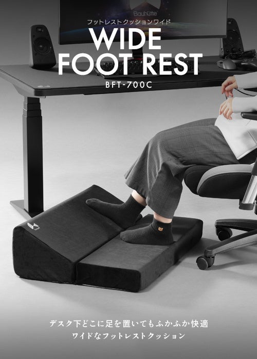 弊社ゲーミング家具ブランド「Bauhutte(R)(バウヒュッテ)」は2024年9月、デスク下をまるごとクッション化するワイドな足置き「フットレストクッションワイド BFT-700C-BK」を発売します。