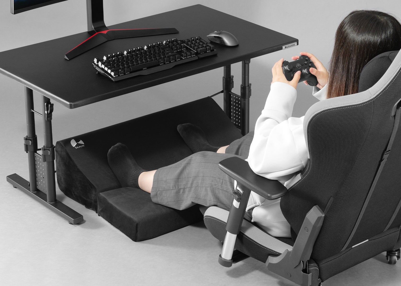 手前には肉厚8cmのフラットなクッションを、奥には心地よい30°の傾斜クッションを設けました。これら2つを合わせ持つことで、あらゆるゲーム姿勢をサポートできます。骨盤を立てて足をしっかり下ろしたり、リラックスして前にゆったり伸ばしたり…デスク下どこに足を置いても、ふかふかクッションが足の重みを優しく受け止めます。ちょうどいい高さ・角度を目指して何度も調整を重ねた最適設計です。