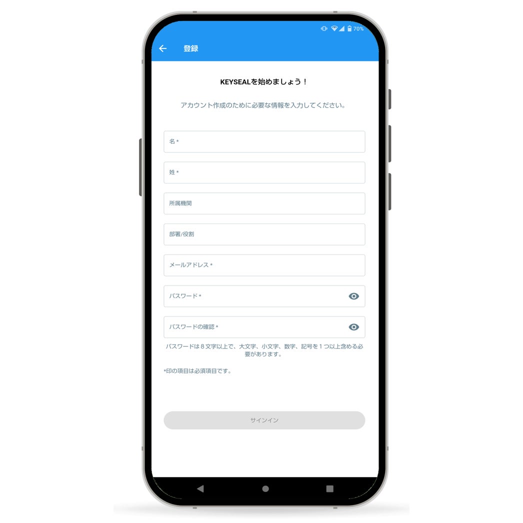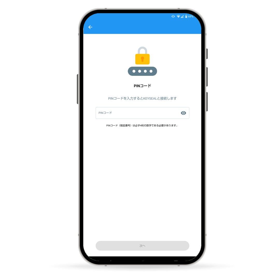 KEYSEALアプリケーションでeシールの押印を開始する前に、KEYSEALの持ち主自身が設定したPIN(暗証番号)を入力することで、強力な認証を行うと同時に、押印者が「当事者」であることのエビデンスとして機能します。
