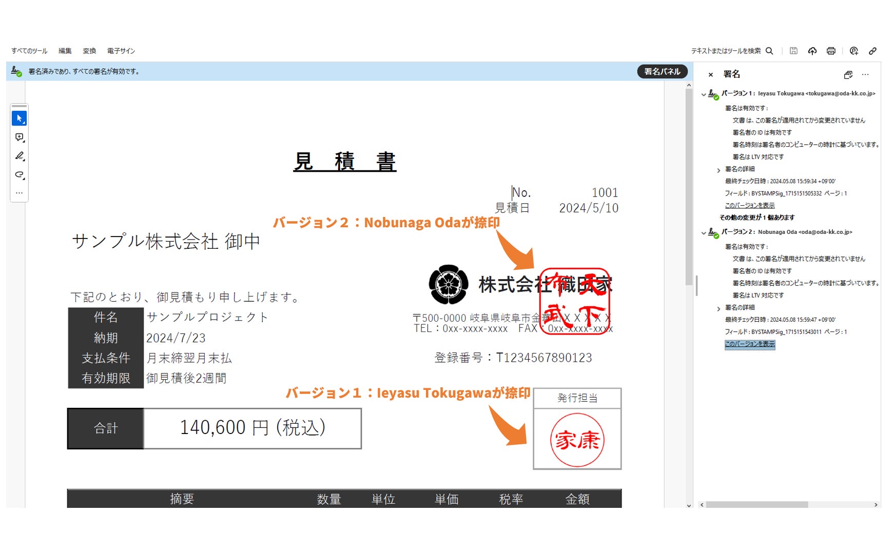 PDFの受領者はPDFリーダーの署名確認から、発行者の情報と文書発行後に改ざんされていないことを確認することができ、該当のデジタル書類の真正性の確認ができ、安心してデジタル文書のやり取りが可能となります。
