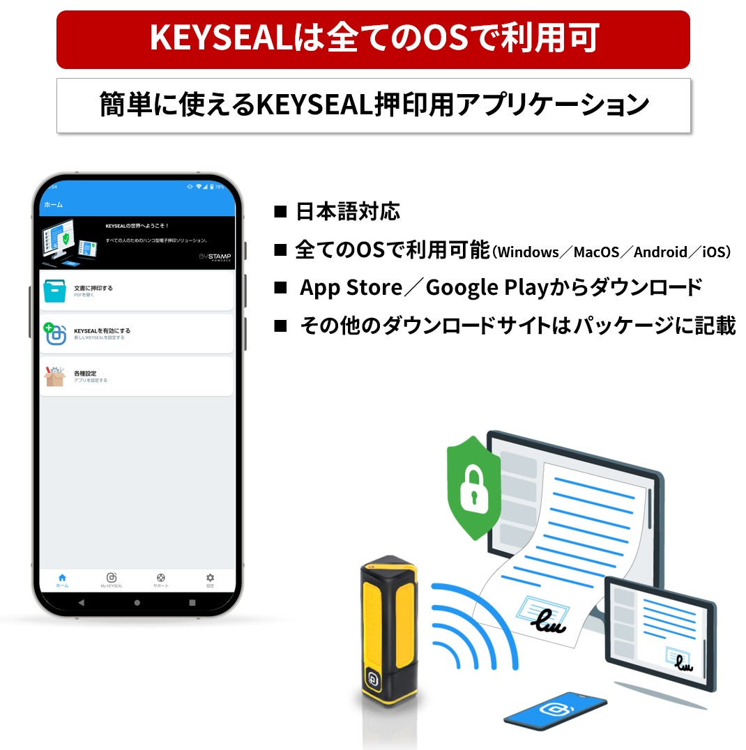 『ポケッタブルeシール KEYSEAL』は、従来の「ハンコ」を押印する感覚で、PDFにeシールを「捺印」するデジタル・ツールです。