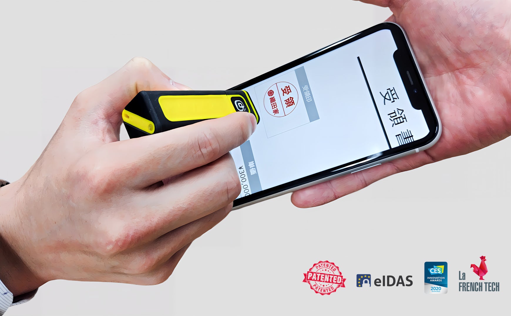 『ポケッタブルeシール KEYSEAL』は、特許を取得した革新的な光学検知技術とBTペアリングの組み合わせによる認証技術を使用しています。