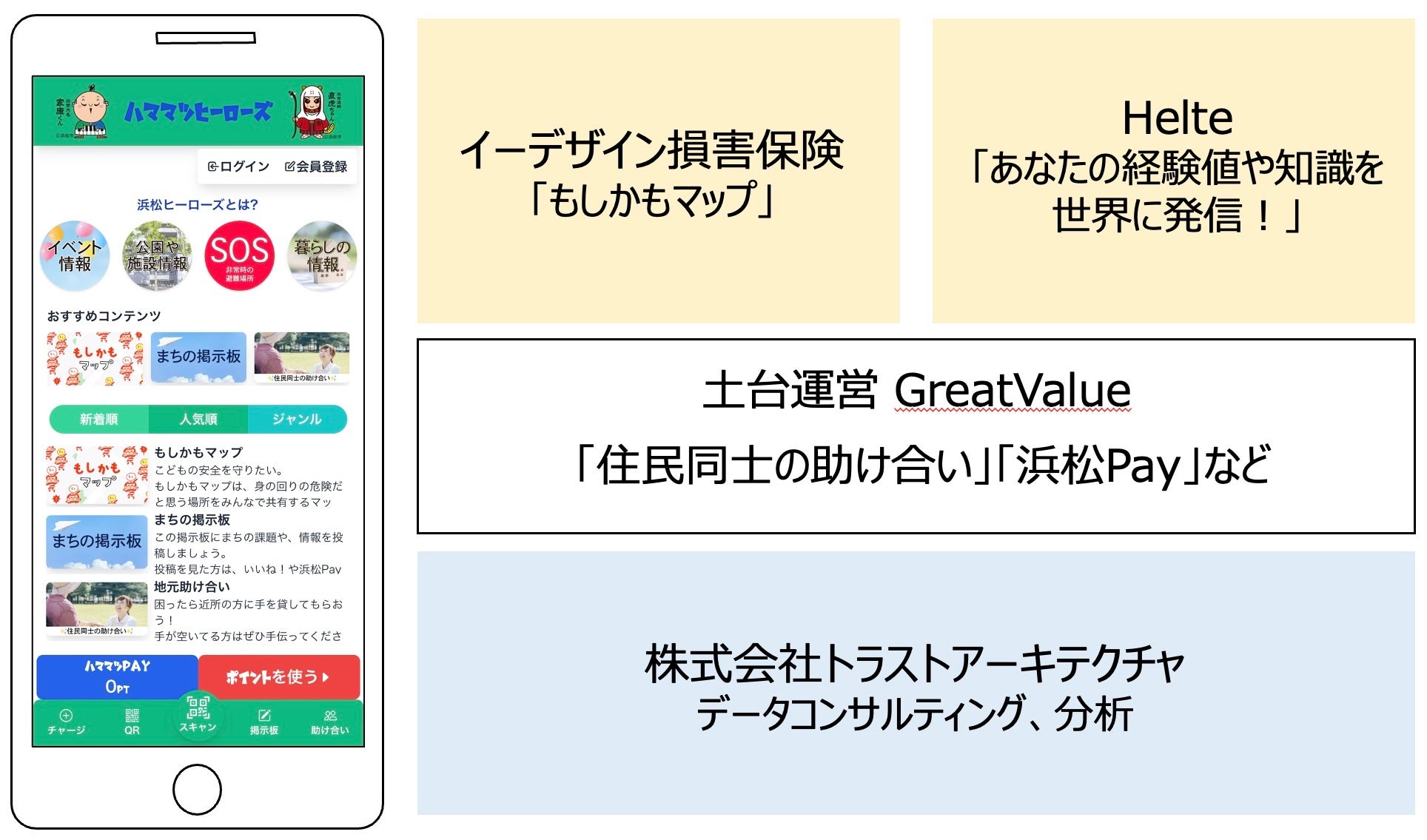 利用を促しながら当初の目的でもある、データ連携基盤活用の「Hamamatsu ORI-Project」を進行させ、新たなサービスやアプリケーションの創出を図ります。本取り組みは4社連合で行われており、当社の助け合いDXを土台として、2社がコンテンツ提供、1社がデータ分析を行う役割を担い、連携事業のモデルにもなっております。