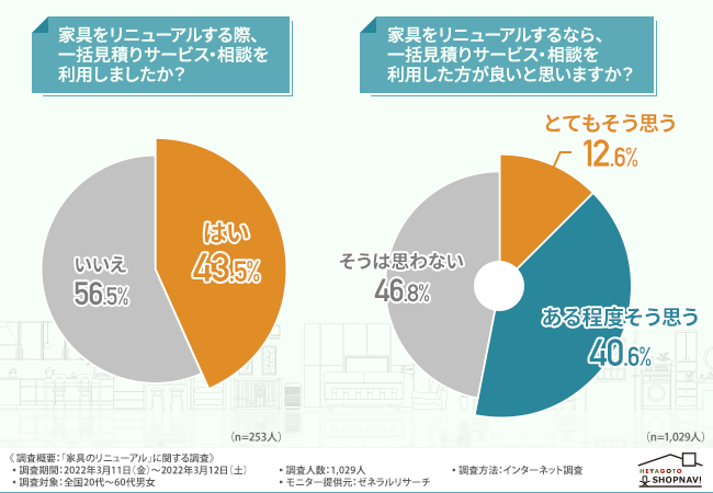 私ども株式会社ヘヤゴトが以前実施した調査(https://prtimes.jp/main/html/rd/p/000000003.000091372.html)では、一括見積り・相談サービスを利用すると効率的に家具を購入できる一方で、信頼できるサービス業者を選ぶことも重要だということが分かりました。
