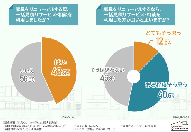 先程の質問で、家具のリニューアルを『した』と回答した方に、「家具をリニューアルする際、一括見積りサービス・相談を利用しましたか?」と質問したところ、『はい(43.5%)』『いいえ(56.5%)』という結果になりました。