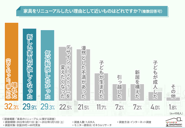 続いて、「家具をリニューアルしたい理由として近いものはどれですか?(複数回答可)」と質問したところ、『壊れた(古くなった、痛んだ)(32.3%)』と回答した方が最も多く、次いで『新しい家具が欲しくなった(29.9%)』『気分転換したかった(29.3%)』と続きました。