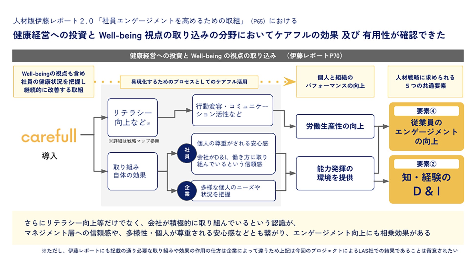 人的資本経営を変革・実現させていくためにどう具体化し実践に移していくかの有用なポイントとして人材版伊藤レポート2.0の中で提言された「3つの視点・5つの共通要素」の枠組みをもとに、くらしアプライアンス社へcarefull(ケアフル)を実証導入した結果を分析すると、「知・経験のD&I」と「従業員エンゲージメント」に好影響があると言えることが分かりました。
