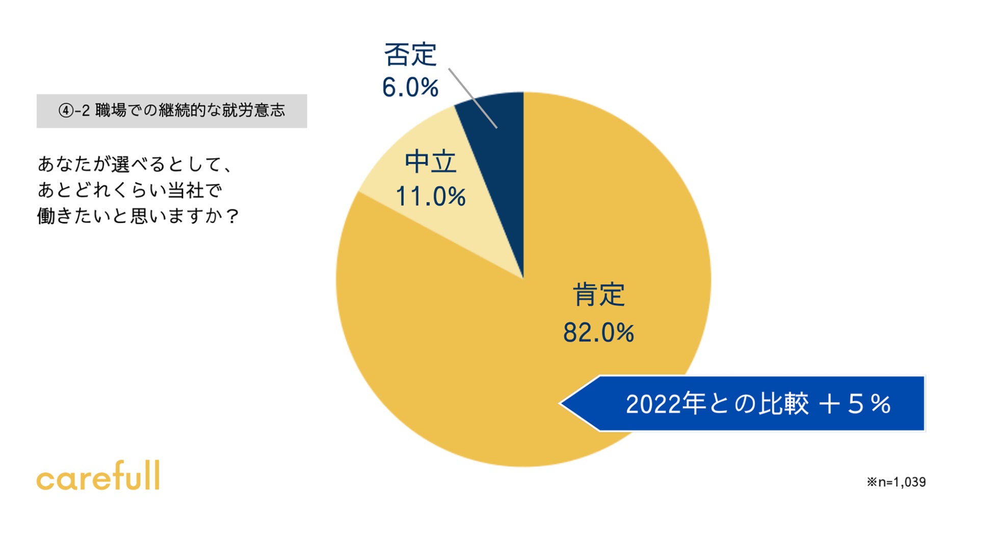 2022年度と比較し、職場への好感度は2%、継続的な就労意志は5%増加し、女性社員の定着および離職防止に関わる項目が改善しました。上記以外にも、マネジメント層に対する信頼などの項目も改善していることから、フェムテック活用の取り組みが身近で見えたことで上層部への信頼感や安心感の醸成につながり、社員エンゲージメントが高まったと考えられます。