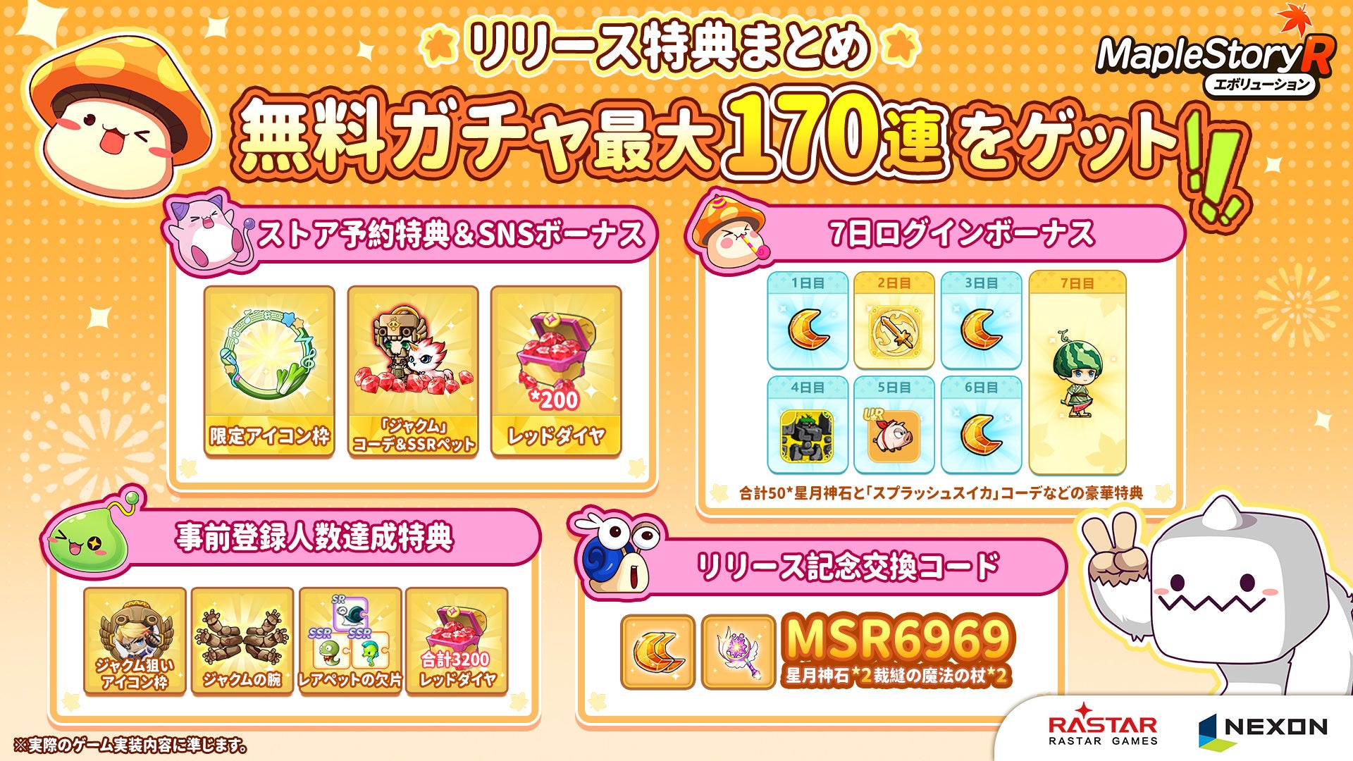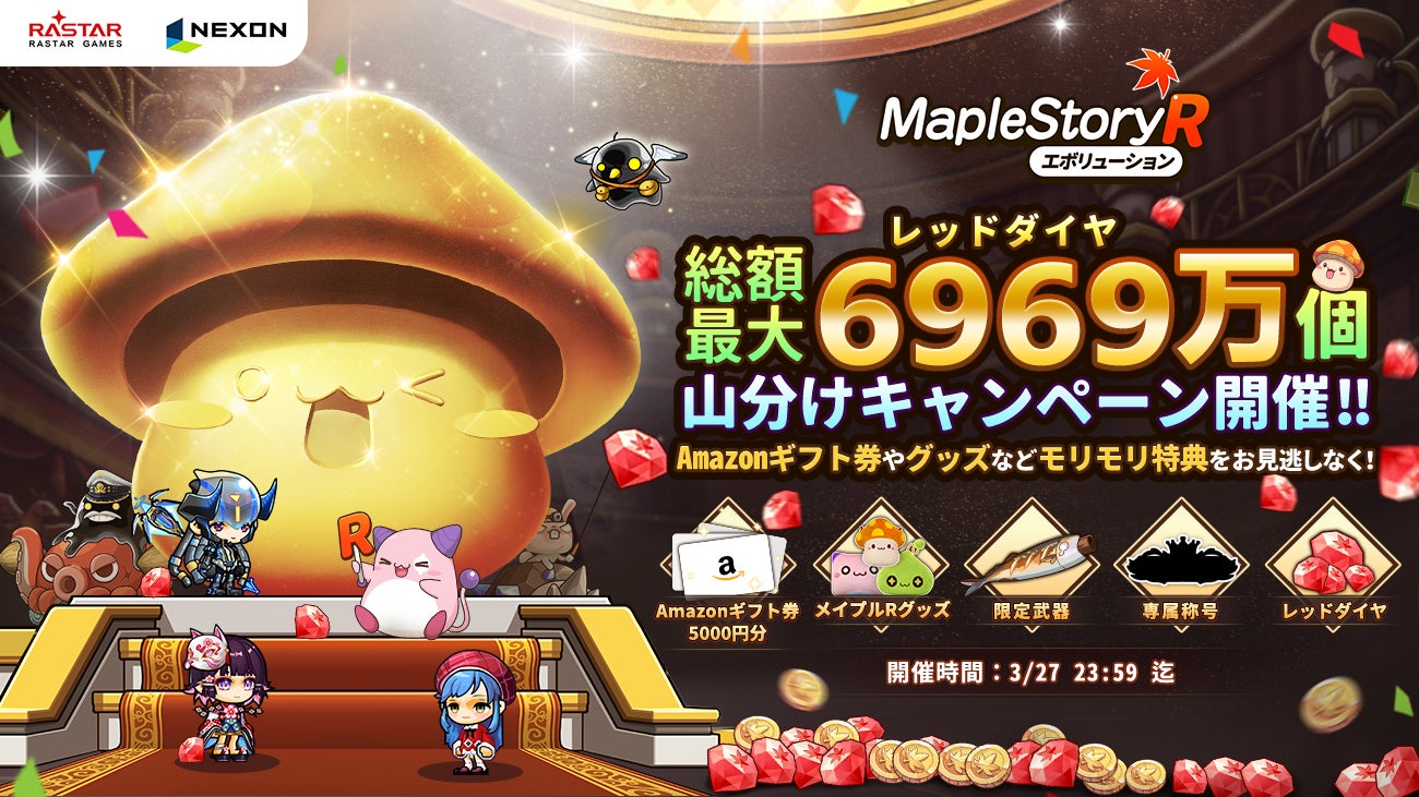 『メイプルストーリーR』の正式リリースに伴い、最大6969万レッドダイヤの山分けキャンペーン開催決定。アマギフ5000円分やメイプルRグッズ、限定武器外観、星月神石などの特典を獲得するチャンスをお見逃しなく!