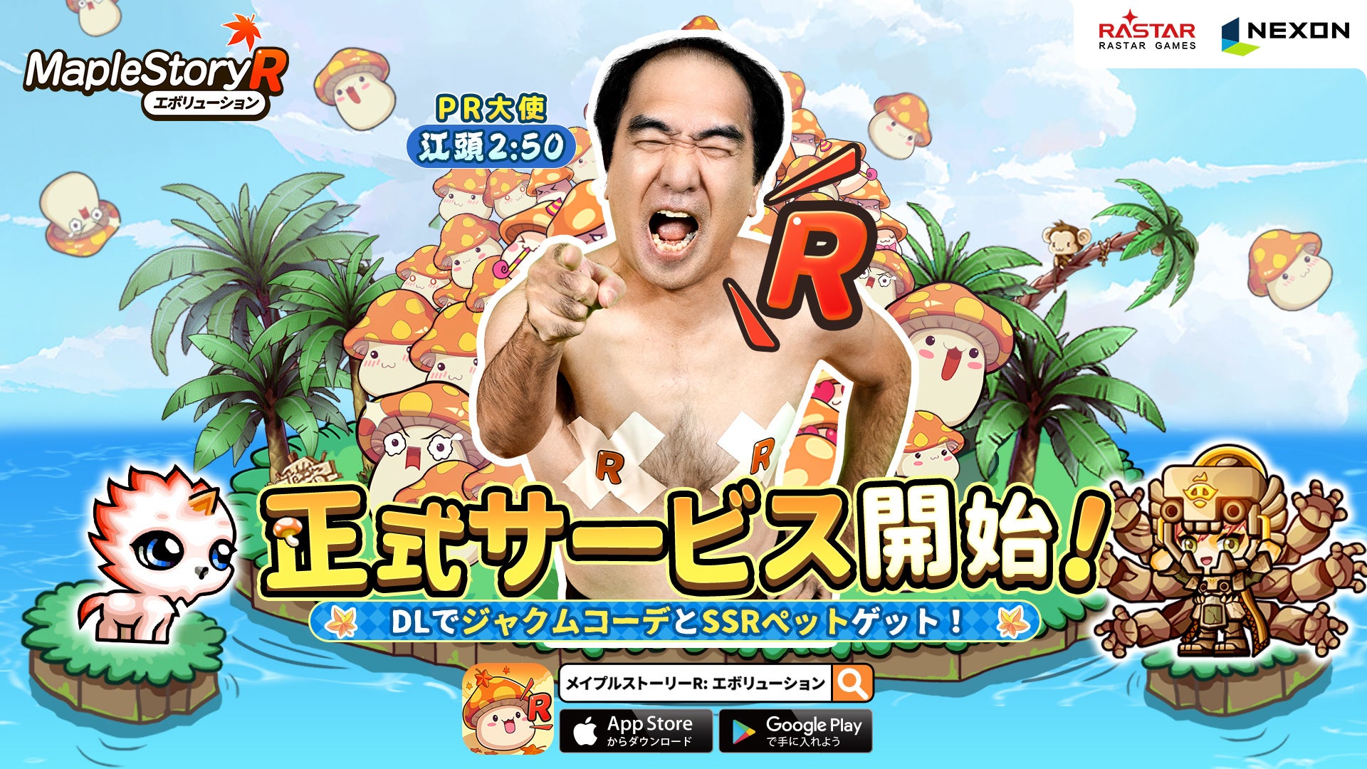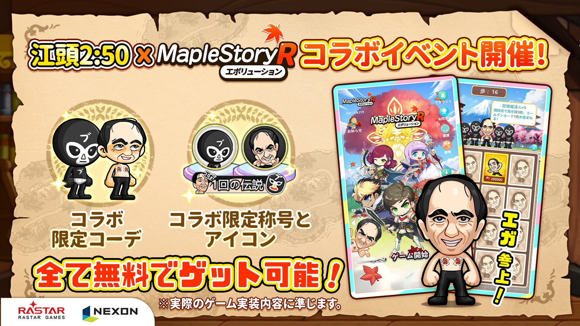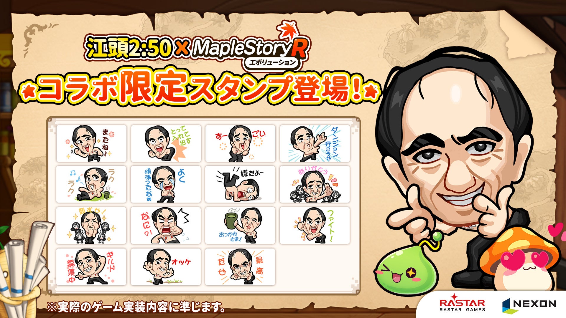 『メイプルストーリーR』では、人気お笑い芸人の“江頭2:50”さんが公式PR大使を務めており、CMや主題歌MVに登場します。また、ゲーム内でのコラボイベントも同日より開催されます。