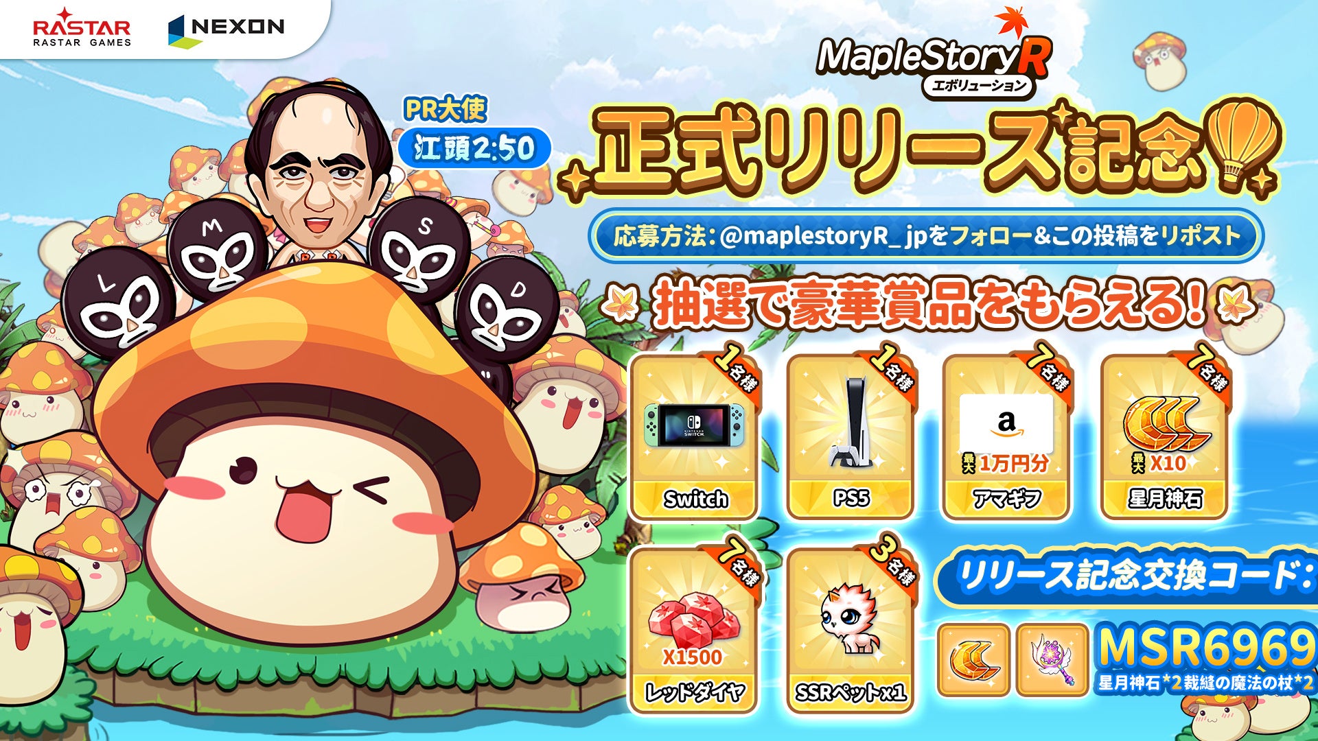 リリースを記念して、@maplestoryR_jpをフォロー&該当投稿をリポストすると、PS5やAmazonギフト券などの豪華賞品が抽選で当たるキャンペーンも開催中です。