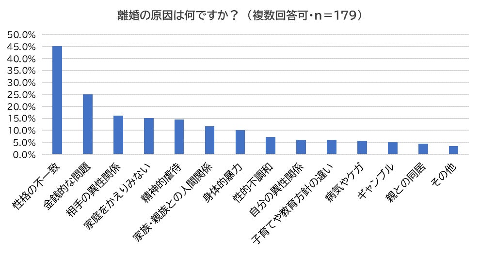最後に、離婚経験者に「離婚の原因は何か?」尋ねたところ、最多は「性格の不一致」(45.3%)となり、以下「金銭的な問題(働かない・浪費・借金・生活費を渡さないなど)」(25.1%)、「相手の異性関係」(16.2%)、「家庭をかえりみない」(15.1%)、「精神的虐待(小言・嫌味・皮肉・モラハラなど)」(14.5%)と続きました。