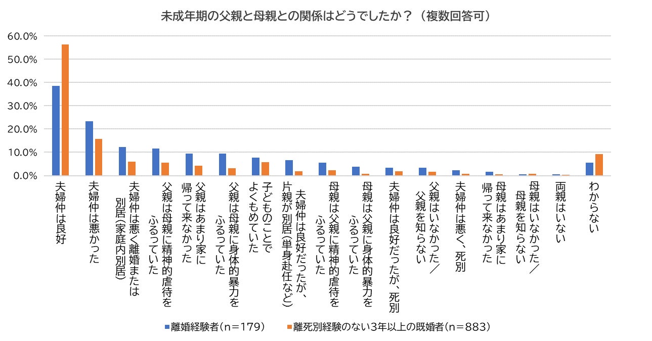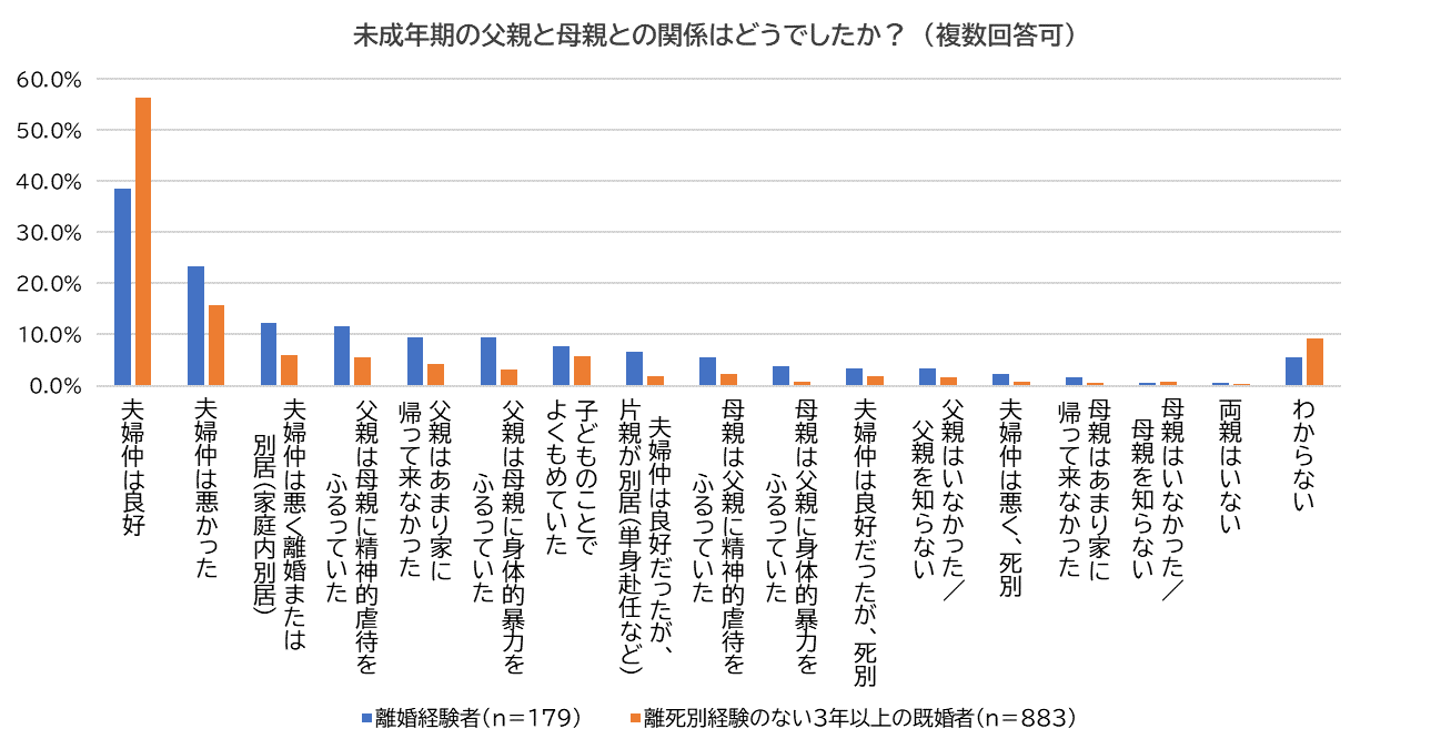 続いて、「未成年の頃、両親はどのような関係だったのか?」それぞれに尋ねました。離婚経験者、未経験者ともに「夫婦仲は良好」が最多となりましたが、離婚経験者が38.5%だったのに対し、未経験者は56.5%と約1.5倍の差がありました。それ以外の良好ではない両親の夫婦関係についても、殆どは離婚経験者の方が多い結果となりました。