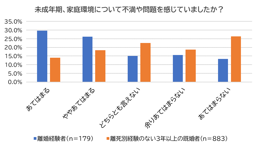 離婚経験者と離死別経験のない3年以上の既婚者(以下、「未経験者」)それぞれに「未成年の頃、家庭環境について不満や問題を感じていたか?」尋ねました。離婚経験者の「あてはまる」(29.6%)と「ややあてはまる」(26.3%)は半数以上(55.9%)もいたのに対し、未経験者の「あてはまる」(14.0%)と「ややあてはまる」(18.3%)は3人に1人32.3%程度となり、離婚経験者は未経験者よりも約1.7倍家庭環境に恵まれていなかった傾向にあることがわかりました。