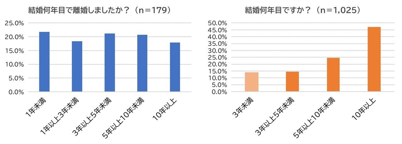 今度は、離死別経験のない既婚者に「結婚何年目か?」尋ねたところ、最多は「10年以上」(47.1%)で、「5年以上10年未満」(24.5%)、「3年以上5年以上10年未満」(14.5%)、「3年未満」(13.9%)となりました。