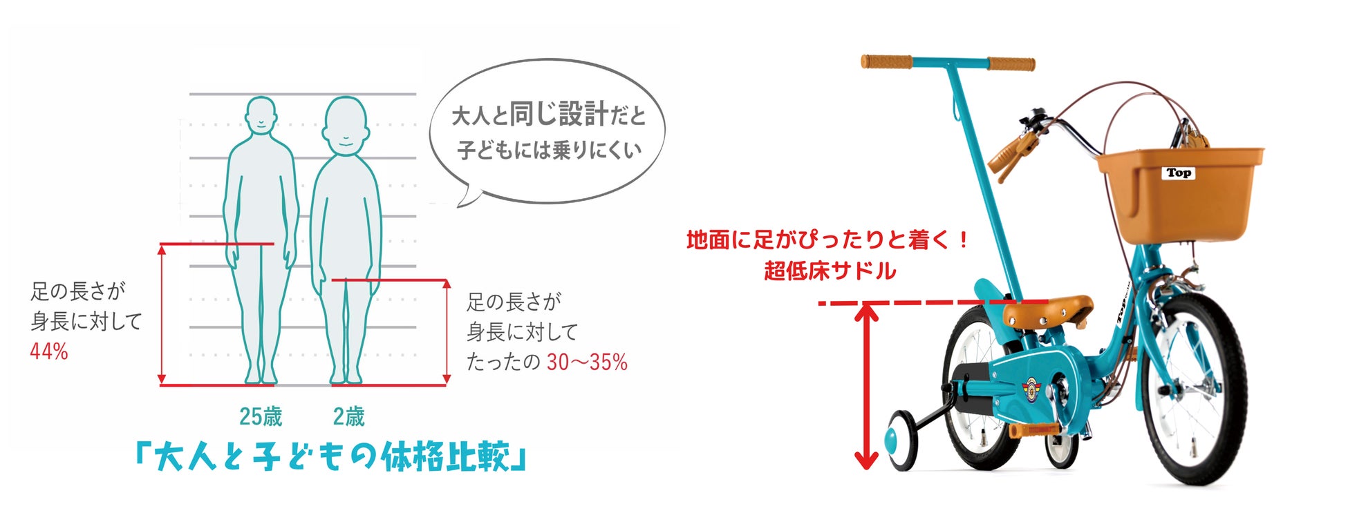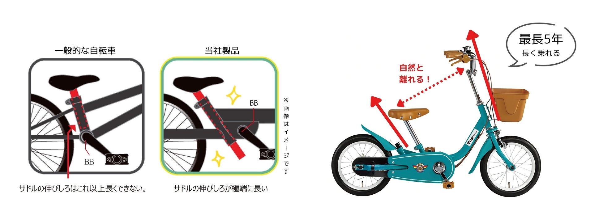 一般的な幼児用自転車は、成長に伴いサドルのみを高くすると、膝とハンドルが近くなるため漕ぎにくい姿勢になってしまいます。