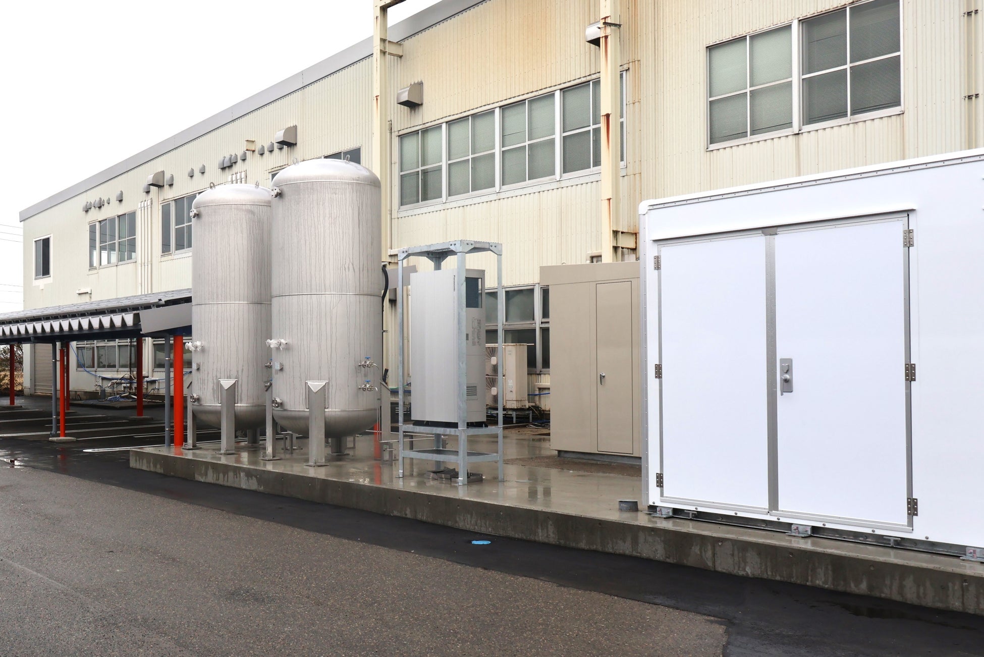 明和工業のレンタル工場で行われる試験運用では、電気を貯める蓄電池に代わるシステムとして導入することで、土日など工場の非稼働時に発生する太陽光発電の余剰電力を使用して水素を貯蔵し、工場稼働時の電力をどれほど補えるかを検証いたします。
