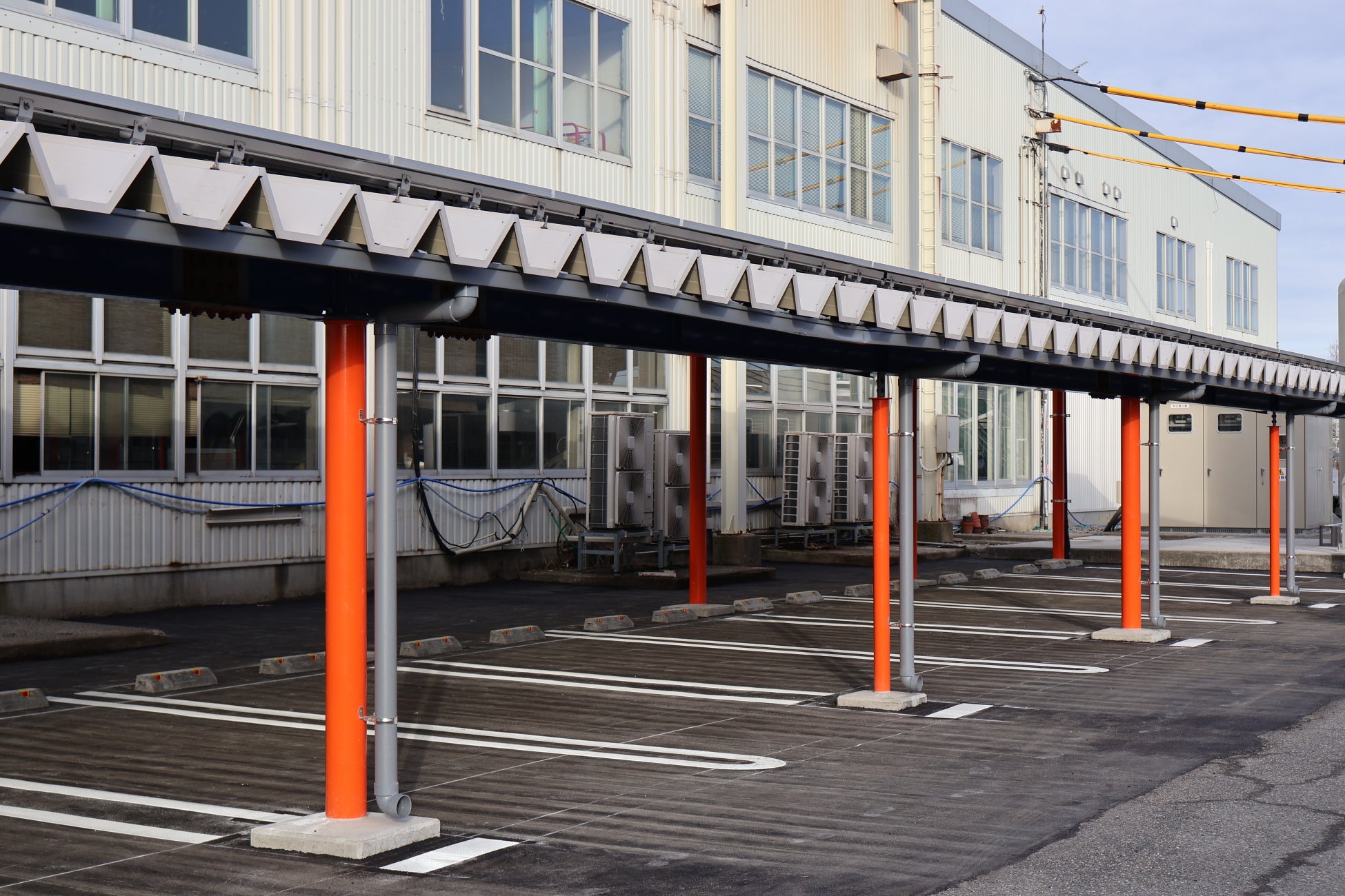 水素蓄電システムは、明和工業のソーラーカーポート「ソラレクト」で発電した電力を使用し、水電解装置にて水素を生成します。生成された水素はタンクに貯蔵し、パナソニック製の燃料電池を用いて発電するもので、本システムは高砂熱学工業の協力のもと設計から施工まで行いました。