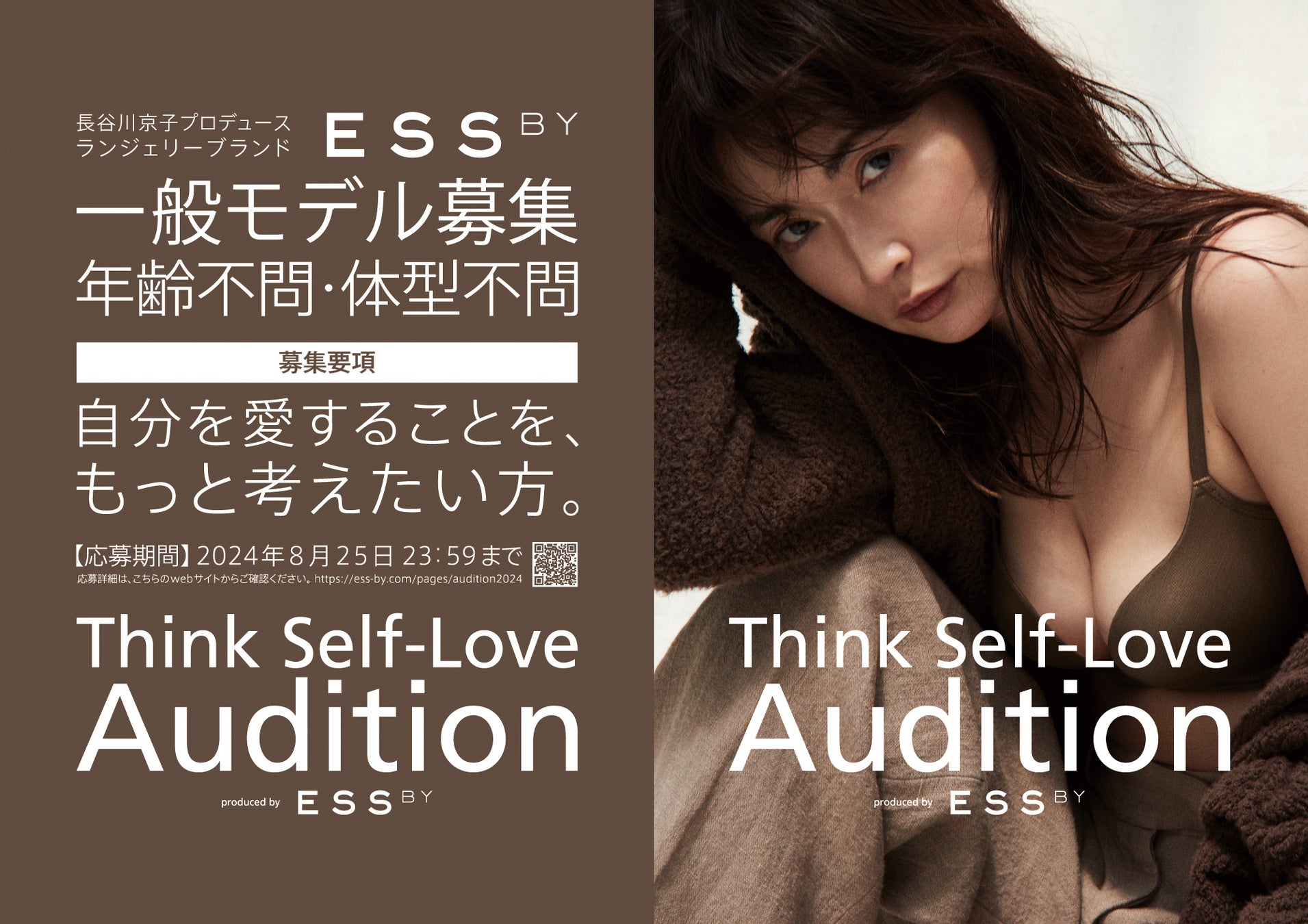 女優・長谷川京子がプロデュースするランジェリーブランド「ESS by(エス バイ)」は2024年10月の新商品発売に向けて、ブランドの世界観を共に発信いただけるモデルを募集する長谷川京子プロデュース第2回モデルオーディション「ESS by Think Self-Love Audition」を開催いたします。前回のテーマ「自愛」からさらに深堀りし、「Think Self-Love(自愛とは何かを考え続ける)」に賛同していただける方々を募集いたします。募集期間は本日8月7日より8月25日までで、応募者には長谷川京子からの「自愛について考える10の質問」に回答していただきます。オーディションで選ばれたモデルのビジュアルは本ブランドの公式サイトやSNSなどで公開する他、都内交通広告に出演していただきます。また、本日から8月13日まで東京メトロ表参道駅にて募集告知のキービジュアルポスターを掲出いたします。