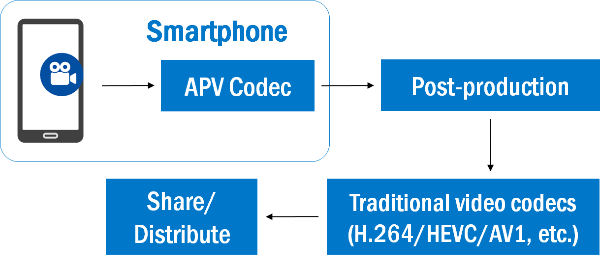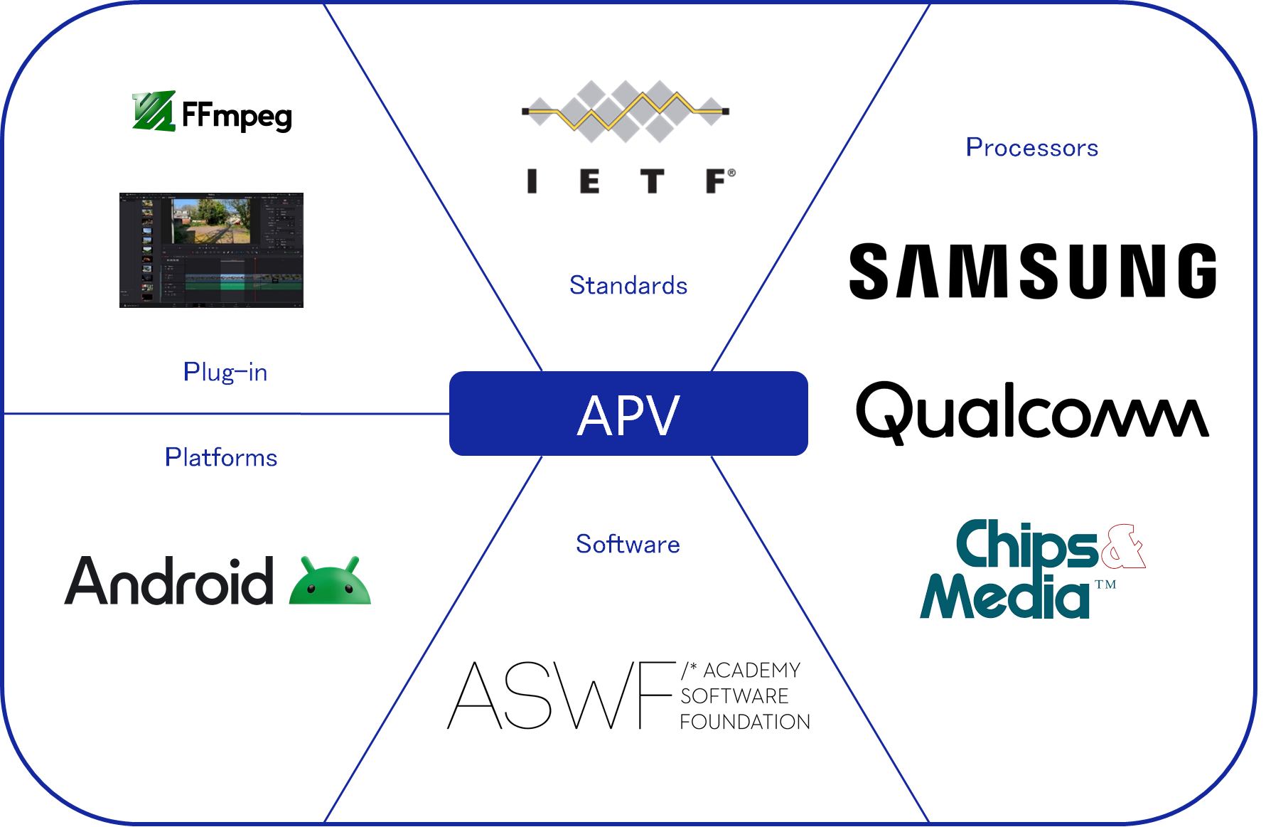 APVは個人クリエイターが、大掛かりな設備を用いることなく、スマートフォン一つでプロフェッショナル動画を作成することが出来る動画フォーマットとなります。従来のプロフェッショナル動画用のコーデックの場合、ライセンスが必要となる、スマートフォンには対応していない、ファイルサイズが大きくなる等の問題がありましたが、APVはこれらを解決し、ロイヤリティフリーで従来規格と同程度以上にロスの少ない処理を可能とします。また、既存ツールであるAdobe Premiereに対応したプラグインを開発しており、APVストリームの編集が可能です。