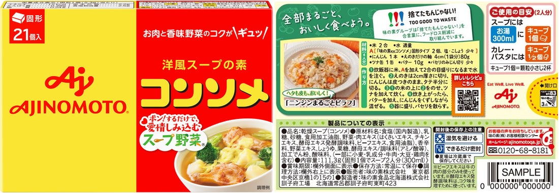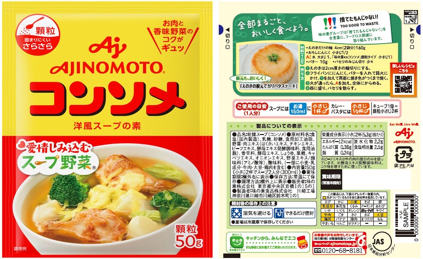 この度、オンラインのみならず、生活者との最⼤の接点である商品を通じて同取り組みを広めていくため、「ほんだし®」、「丸鶏がらスープ™」、「味の素KKコンソメ」のパッケージ裏面で「TOO GOOD TO WASTE~捨てたもんじゃない!~」を紹介する製品を発売します。