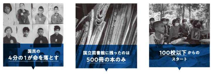 1975~1979年の3年8ケ月20日続いたクメールルージュ政権下で、国民の約25%が、強制労働による過労、餓死、また虐殺により命を落としました。虐殺の対象となったのは、前政権の公務員、知識人といわれる医師や僧侶、教員でした。政権崩壊後、生存した小学校の教員は2割程度と言われています。 | 内戦中、カンボジア国立図書館は閉鎖。「本は余計な知識を与えるもの」と多くが燃やされるか、兵士の巻煙草の紙として使われました。内戦終結後、国立図書館にあった蔵書の内、使用できる本は500冊のみ。作家も知識人として処刑されていたため、本をかける人が、カンボジアからいなくなりました。 | 内戦中、カンボジアのすべての教育機関は閉鎖となりました。1979年のクメールルージュ政権崩壊後、再開できた小学校は全国で97校のみでした。いまでも、一番近い小学校まで何十キロも離れている村々があり、通学が困難な子どもたちもいます。特に障害がある子どもは、進学をあきらめるケースが見られます。 |