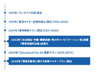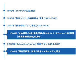 1993年にカンボジア王国となり、民主主義国家の一歩を踏み出します。カンボジア教育省も教員養成、学校建設、教科書づくりなど、マイナスからのスタートでした。そのため障害がある子どもたちの法整備が遅れ、2009年に初めて「障害児教育に 関する政策マスタープラン」ができました。