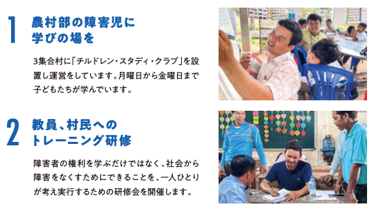 2021年からは、カンボジアの農村部に暮らす障害児が、集い、遊び、学ぶことができる教室「チルドレン・スタディー・クラブ」を3集合村で運営しています。
