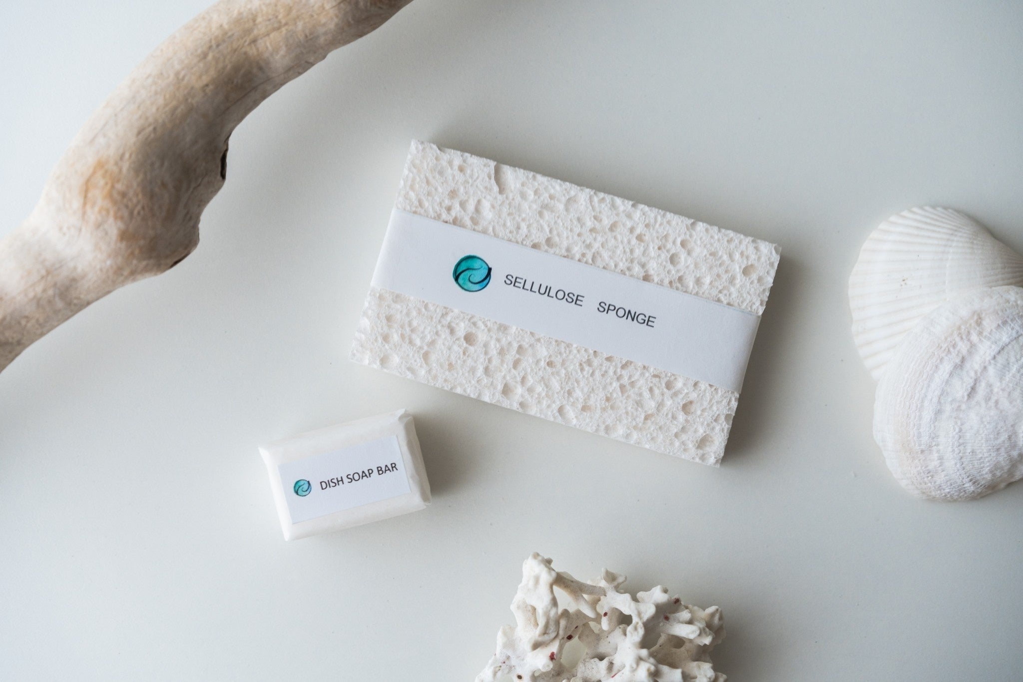 植物由来の成分で作られた台所用石鹸約25gサイズと植物繊維で作られたセルローススポンジの、肌と環境に優しいセットを550円(税込)で販売いたします。