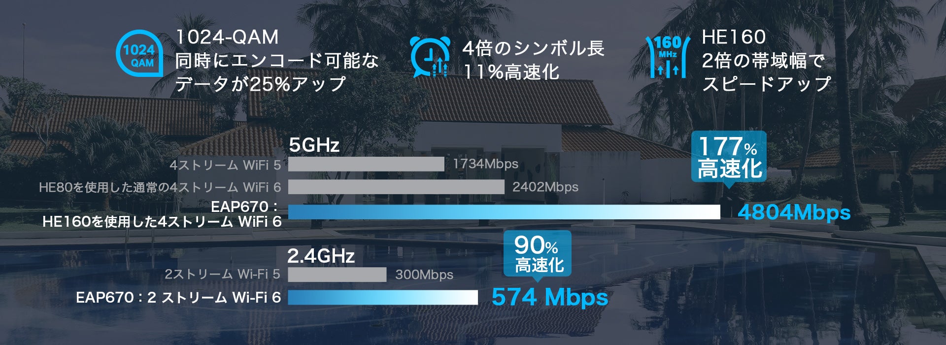 EAPシリーズ最速の最大通信速度5378Mbps(4804Mbps/5GHz + 574Mbps/2.4GHz )の高速接続を実現します。