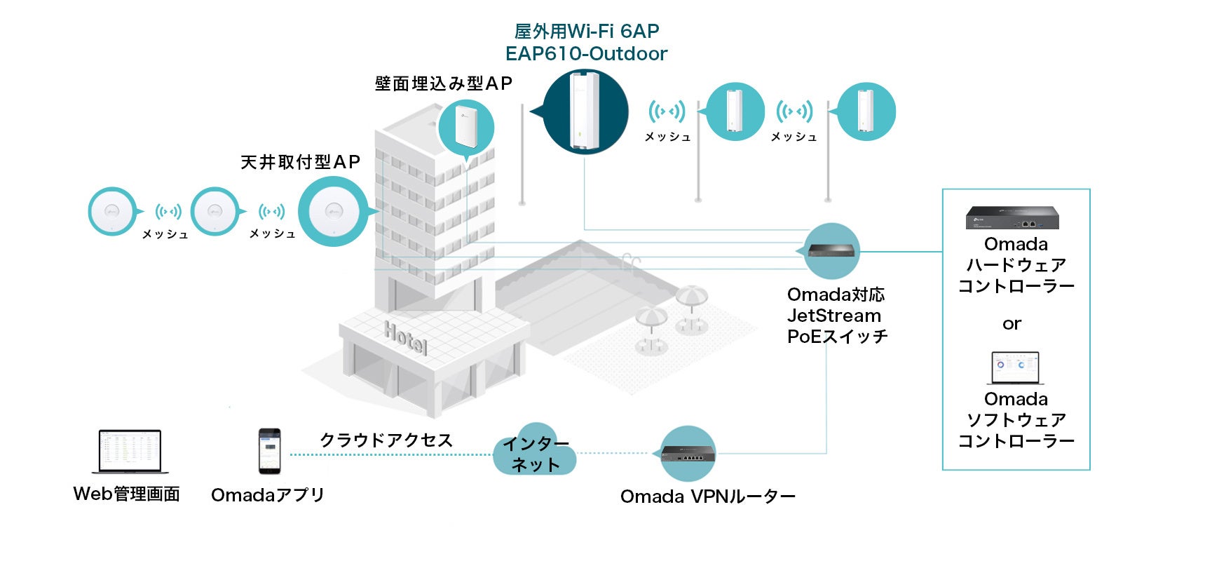 ・Omadaメッシュ*4:アクセスポイント間でシームレスなワイヤレス接続が可能となり、柔軟なカバーエリア拡張と展開を実現