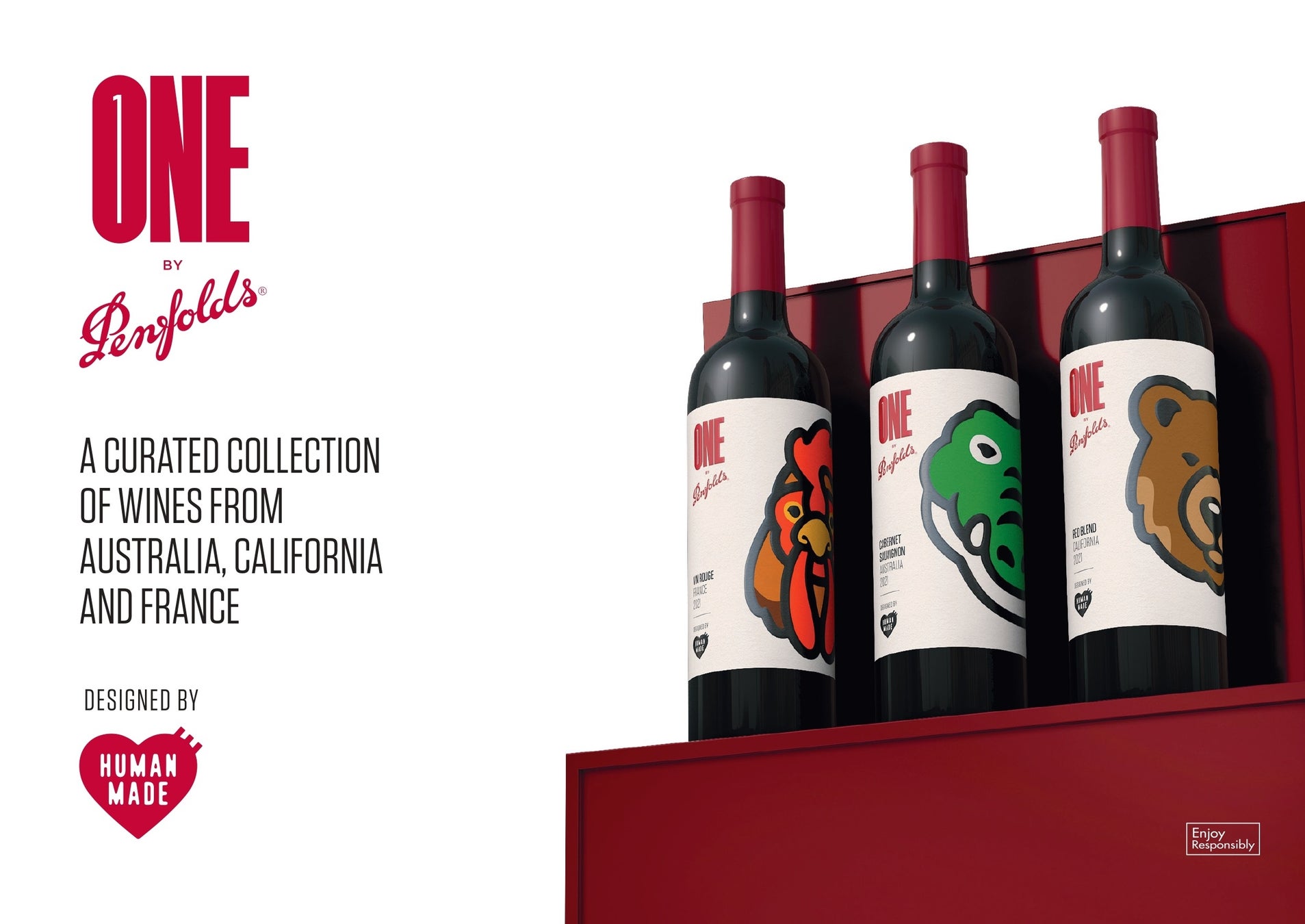 それぞれのワインラベルには、NIGO®のスタイルを活かし、クロコダイル、雄鶏、熊、パンダ*の4つの動物をモチーフにしたデザインが施されており、これらのデザインは ワン・バイ・ペンフォールズが生産される4つの地域(オーストラリア、フランス、アメリカ、中国*)をそれぞれ表しています。