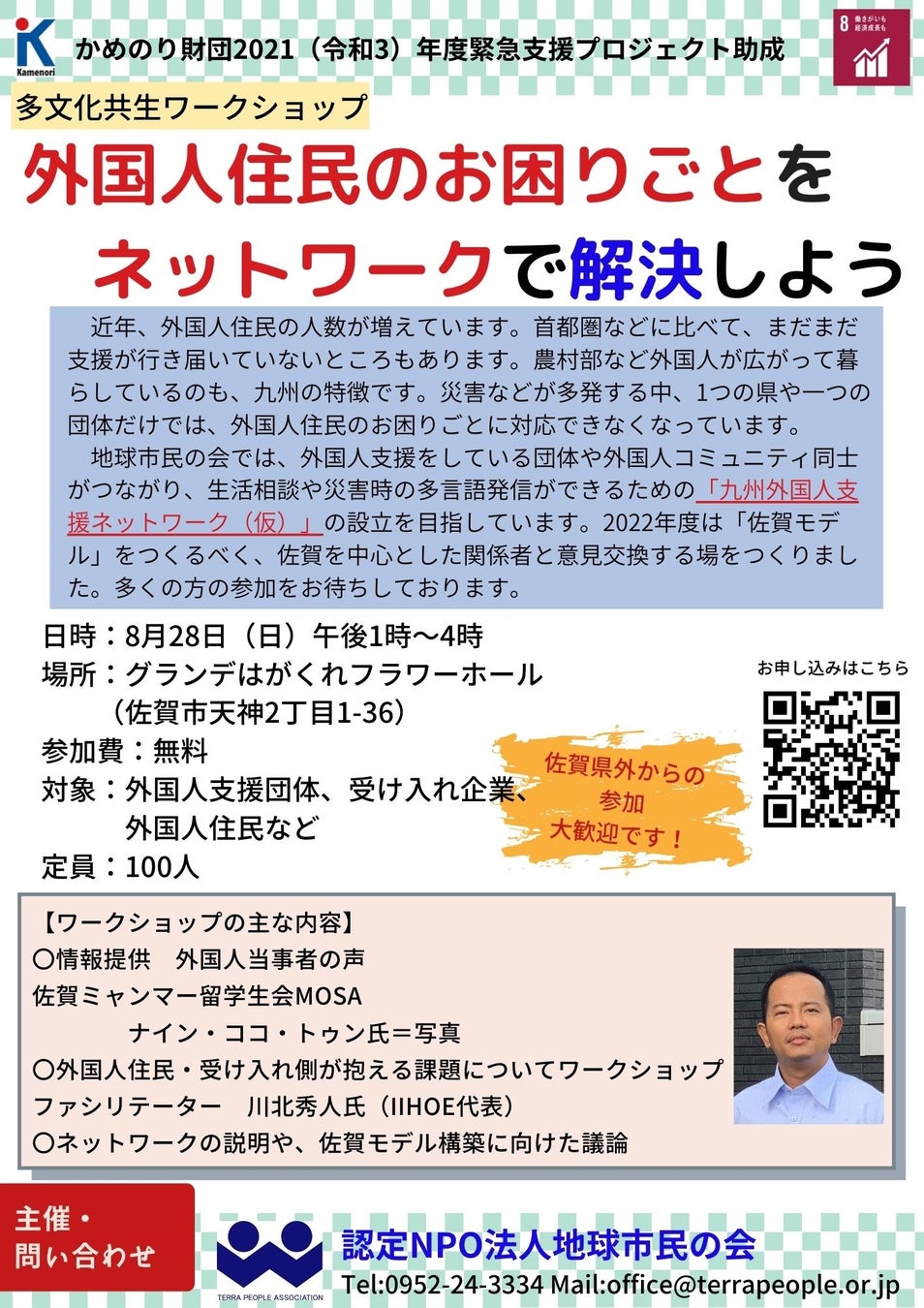 そこで地球市民の会では、外国人支援をしている団体や関係者、外国人コミュニティ同士がつながり、生活相談や災害時の多言語発信ができるための「九州外国人支援ネットワーク(仮)」の設立を目指しています。まずは「佐賀モデル」をつくるべく、8/28にワークショップを企画しております。佐賀の団体や企業の方と、日ごろ抱える悩みなどを共有し、その解決策を探ります。ミャンマー人コミュニティのリーダーから事例発表していただいた後、興味のあるテーマに分かれて、課題や解決策などを話す場をつくれたらと思っております。佐賀県外からの参加も大歓迎です。どうぞ多くの方のご参加をお待ちしております。