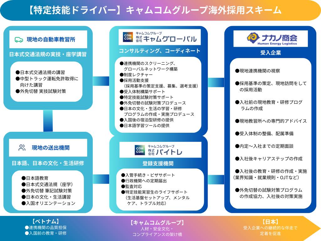 自動車運送業は特定技能に追加されて間もなく、国内には他業種のような経験者の人材プールがほとんど存在しません。そのため、即戦力採用に向けた現地機関への能動的なアプローチが必要となり、企業が独自に持続的な人材確保をするには限界があります。キャムグローバルではこの構造的課題を解決するため、ベトナム現地の機関と戦略的に連携。現地での直接採用・育成・登録支援・定着支援までをワンストップで行う継続的な採用にも対応可能な独自スキームを確立しました。