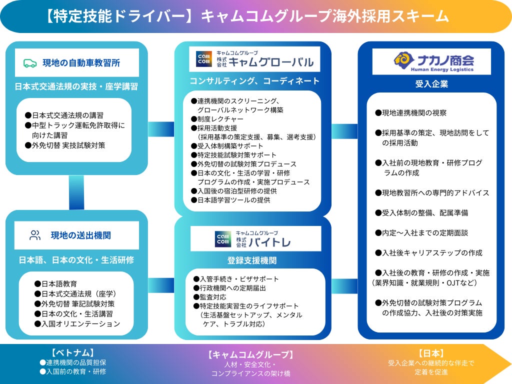*2 受入機関である株式会社ナカノ商会と、コンサルティングを行う株式会社キャムグローバル間で、「特定技能外国人(自動車運送業)の採用・育成に関する協定」を締結し、登録支援機関である株式会社バイトレが人材紹介と生活支援を行うことで、共同で採用・育成・生活支援を行っています