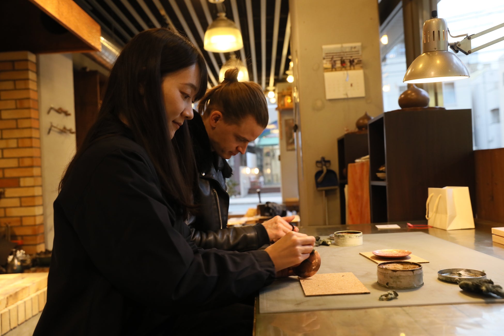 磨いて色をつける 磨き粉をつけて表面が鏡のように光沢が出る まで磨きます。現在(素)はこの工程で磨き 上げます。その後、色上げ作業に入ります。 過去(染)仕上げは硫化カリウム水溶液に浸 し、現在(炎)仕上げは火にかけて色を出し ます。