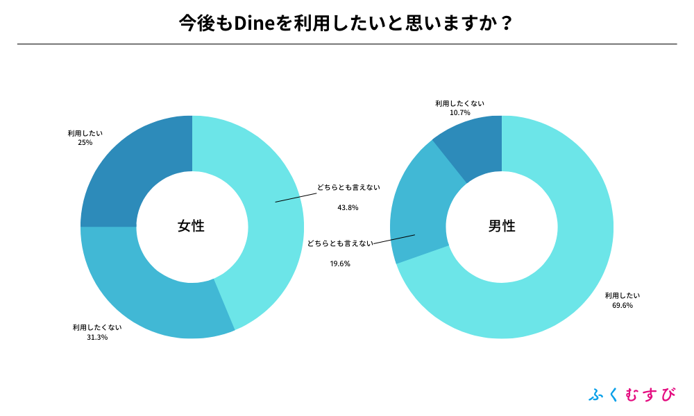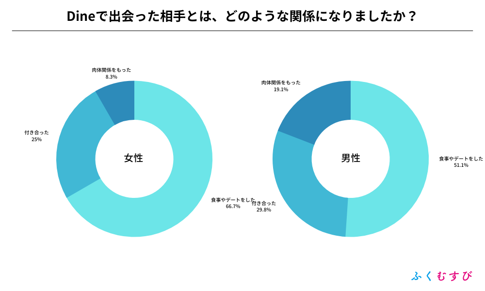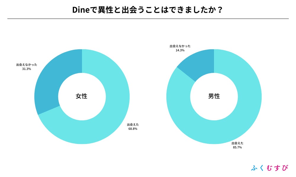 ・Dineで異性と出会えた割合は、男性が85.7%、女性が68.8%となりました。