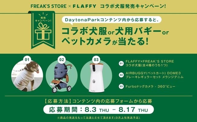 FLAFFYとのコラボレーションを記念して、ワンちゃんたちと愛犬家の皆様に向けた、豪華景品が当たる !キャンペーンを実施します。Daytona Park CLUB入会の上、応募フォームよりご応募ください。