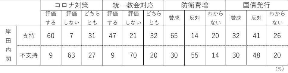 一方、表中の右側、「防衛費を大幅に増やすこと」や「(財源として)国債を発行すること」への評価をみると、前者については、内閣の支持層と不支持層との間で大小関係に逆転が存在していますが、後者に関しては支持層-不支持層間に大きな相違は存在していません。